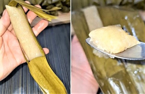 Using a spoon or a small cup, scoop a portion of the cooked glutinous rice and place it in the center of each banana leaf. A good amount is about 2-3 tablespoons of rice, but you can adjust it based on your preference. -